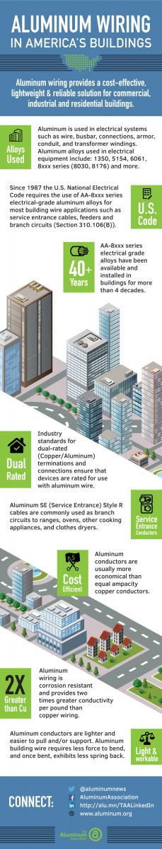 Aluminum wiring is corrosion resistant and provides twice the conductivity per pound compared to copper wiring. And, aluminum wiring requires minimal energy to recycle and loses none of its properties during the recycling process.