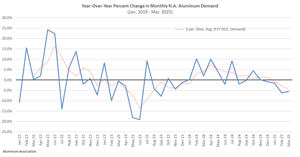 As part of its monthly Aluminum Situation statistical report, the Aluminum Association released preliminary estimates showing a 4.1% year-over-year decline in aluminum demand for North America (U.S. and Canada) through Q1 of 2025. The decline was driven largely by drops in export markets and ingot shipments.
