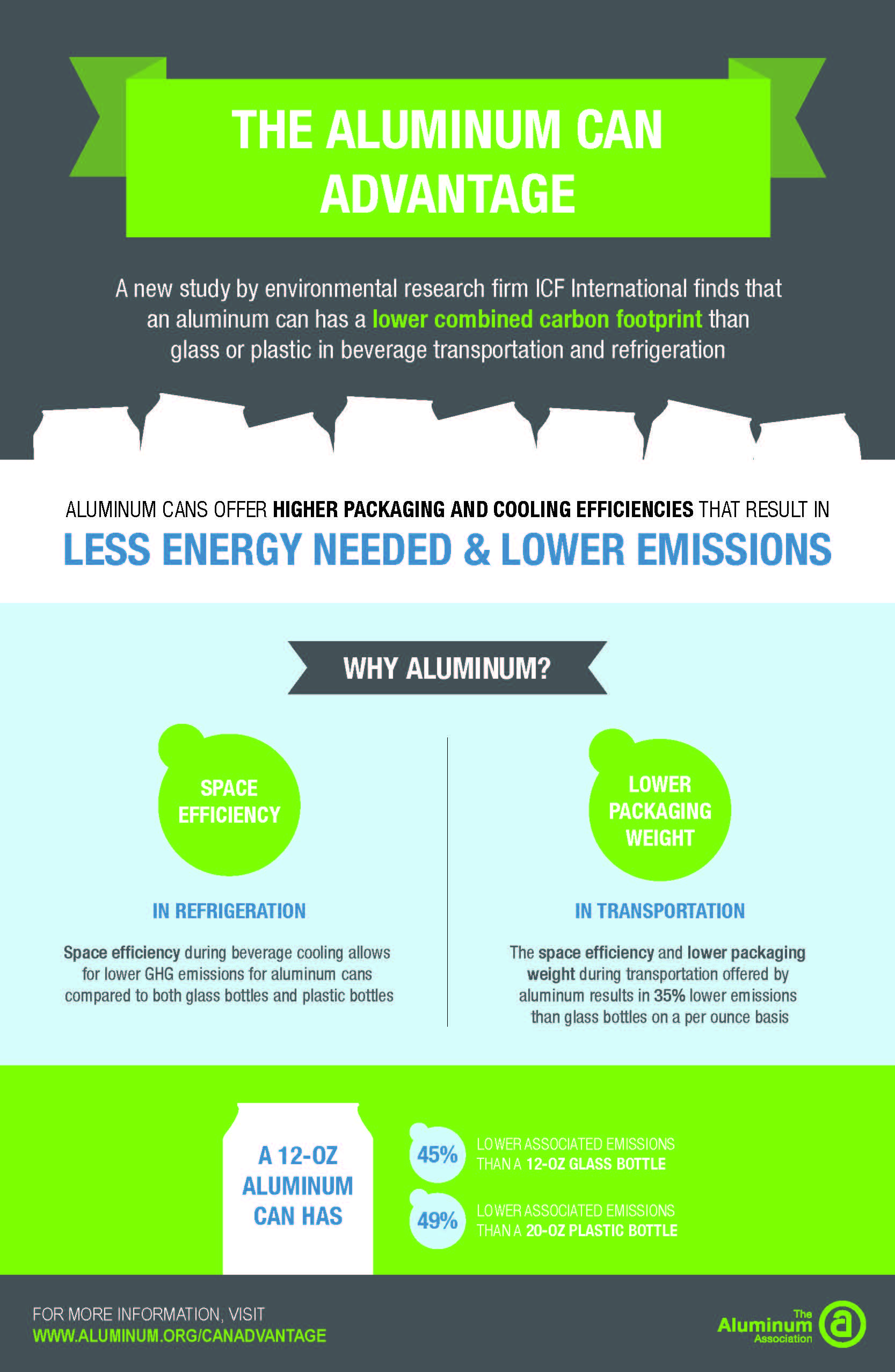 A 2016 study completed by ICF International finds that the combined greenhouse gas (GHG) emissions associated with the transportation and refrigeration of beverages in aluminum cans are lower than those associated with that of beverages in glass or plastic bottles under the same conditions.
